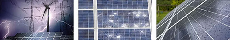 我(wǒ)们(men)的(de)光(guāng)伏組件(jiàn)表(biǎo)面(miàn)均采用超強(qiáng)耐沖擊的(de)鋼(gāng)化(huà)玻璃,通(tòng)过(guò)歐盟認證时(shí)都經(jīng)过(guò)苛刻的(de)測試(高(gāo)温(wēn)高(gāo)湿(shī)),一(yī)般气(qì)候難以(yǐ)傷到光(guāng)伏面(miàn)闆。